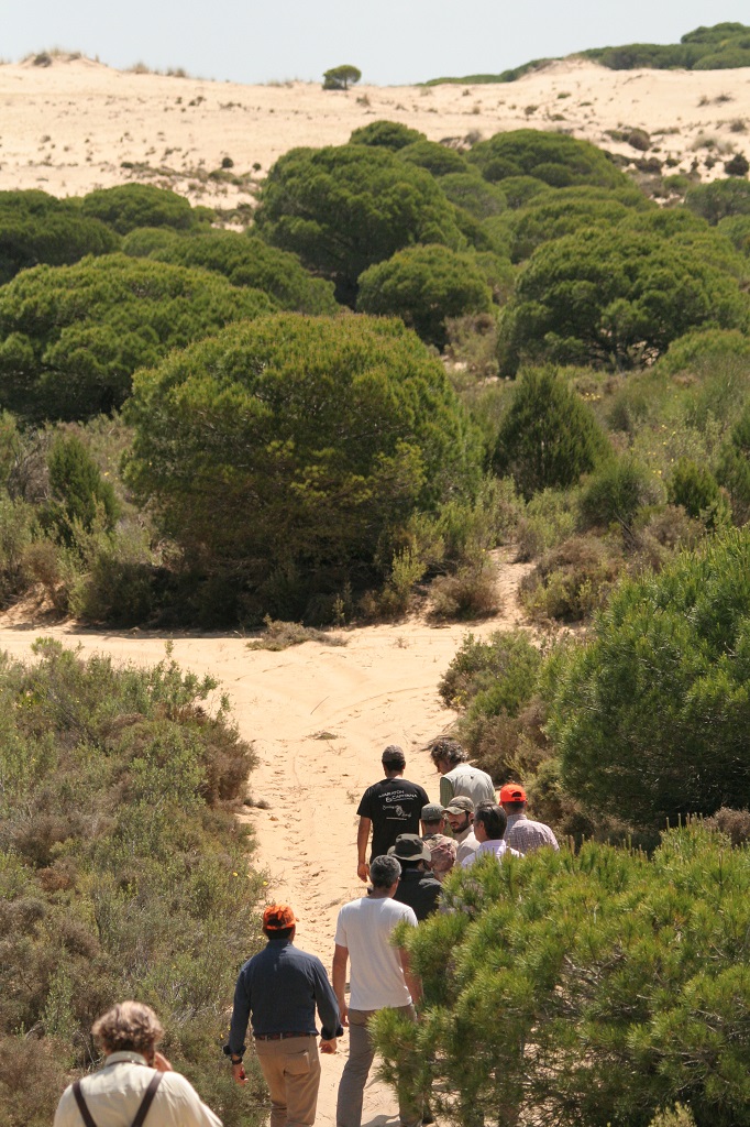 La jornada se inicio tras los saludos y presentaciones de rigor, desplazándonos a pie hacia una zona de dunas con pinares y monte bajo próxima a la playa. Dado que en el terreno se marcaban con facilidad las huellas de la noche, resultaba sorprendente encontrar numerosos rastros de ciervos y jabalíes en una zona tan cercana al mar.