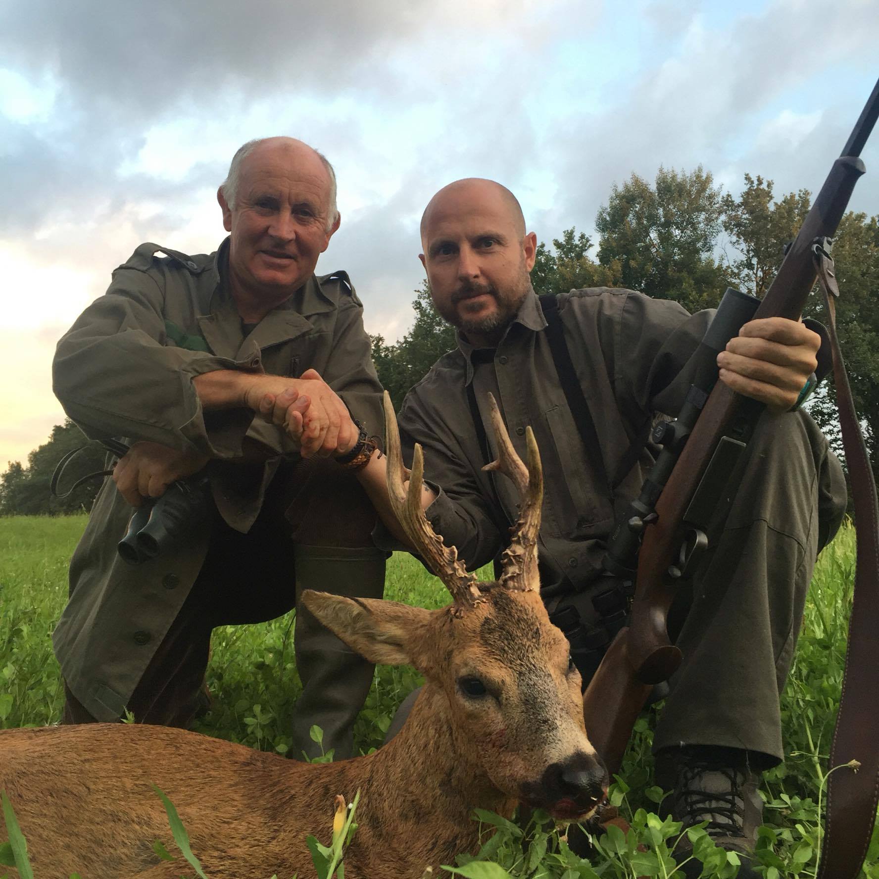 Nada más bajarnos del coche nos esperaban el guarda y los dueños de la casa, muy amables. Nos cambiamos y de nuevo nos montamos en el coche con el guarda para salir a cazar. Dice que tiene una pareja controlada y así fue. Tan solo habían pasado diez minutos cuando dimos con ellos, el macho parecía muy bonito. Habíamos decidido que dispararía yo en primer lugar y después del día que habíamos tenido me entró un pavo. Me serené y apreté lentamente el gatillo… ¡El corzo había caído! ¡Mi primer corzo francés! El compañero y yo nos dimos un abrazo y seguidamente el correspondiente apretón de manos con el guía.