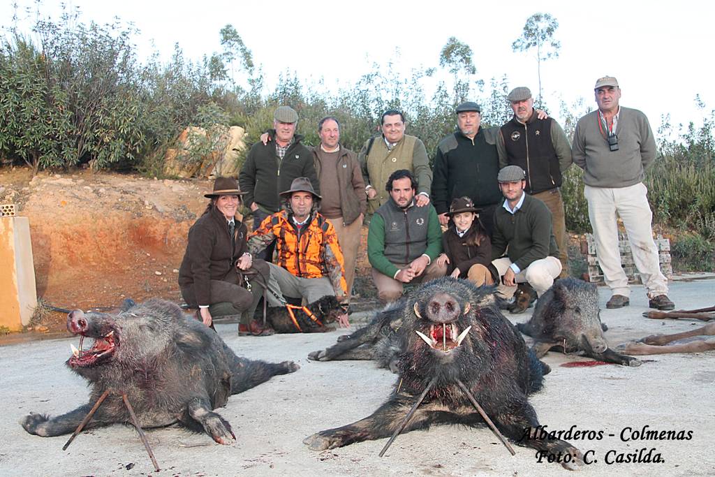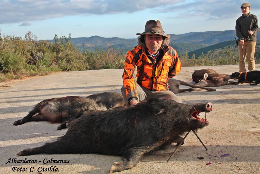 Hubo monteros afortunados como el amigo Santi, centro de atención de los presentes, con una postura donde falló un jabalí hasta en tres ocasiones buscando el agujero de la alambrada, quedando herido otro que no se pudo cobrar, y abatiendo finalmente un tercero que en intenso lance quedó primero herido en un disparo imposible y fugaz y siendo rematado a cuchillo, como mandan los cánones, por el amigo Rafita. Y también los hubo desafortunados, como el amigo Miki Morón, que con una postura intensa, con numerosas ladras y atropellos de monte, cuando finalmente iba a romperle un buen cochino fue espantado por su compañero de postura y se quedó, de nuevo, compuesto y sin lance. El puesto número dos de Manuel Infante, ocupado por un servidor, también destacó, cobrando una cierva y rematando una cochina herida por el ocupante del puesto número cinco de la misma armada.