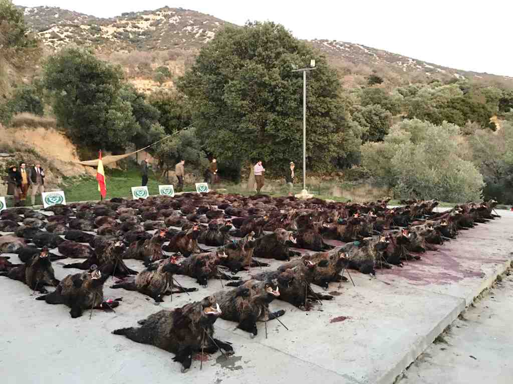El tiroteo fue contante y muy chorreado, convirtiéndose en algunos momentos en un autentico ojeo de perdices, momento este en el que las rehalas batirían el centro de la mancha, haciendo salir a gran numero de jabalíes hacia las posturas. Puestos que, como siempre, se divertirían de lo lindo, y también unos más que otros. Como el numero 2 de Barranco Hondo, con nada menos que 23 jabalíes cobrados; el 4 de Barranco Hondo, con 12; o la armada de la Raña, en la que se cobrarían entre tan solo 6 puestos 65 jabalíes. Al final de la jornada y bajo el atardecer se formaría un magnifico plantel de nada menos que 188 jabalíes, de entre los que brillaría la calidad de muchos de ellos. Tarde en la que nos despedimos con las vistas puestas ya en la próxima temporada.