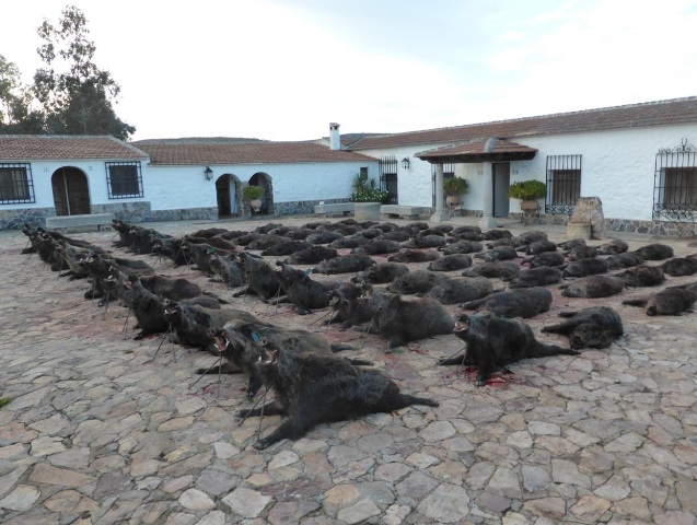 Ya por el simple hecho de montear entre amigos y en las fechas en las que sería la montería, todo esto haría del día un tanto especial y si a todo esto le sumamos un sinfín de lances, grandes carreras de podencos tras importantes macarenos, que terminarían en el suelo tras inolvidables lances, qué más se puede pedir. Mucho antes de soltar los perros el tiroteo de los 6 puestos sería lo más parecido a un ojeo de perdices, teniendo algunos de los puestos 3, 4 o 5 jabalíes cobrados en tan solo 20 minutos de montería. Tras la suelta de las rehalas el monte se rompería en carreras y más carreras, ya que de una misma ladra podríamos contemplar la belleza de romperse una rehala tras varios macarenos en un mismo testero. A media mañana y como se tendría previsto el numero de guarros sería muy alto, se realizaría una suelta de rehalas de refresco. Rehalas que una vez más darían muchísimo juego a los monteros, ya que los valientes podencos terminarían la mañana exhaustos de tal cantidad de caza. Al final de la tarde y después de un exquisito catering podríamos disfrutar de un gran plantel formado por 85 jabalíes. Pero en este gran día lo importante no sería el número de estos, sino el número de monteros ya que serían tan solo seis.