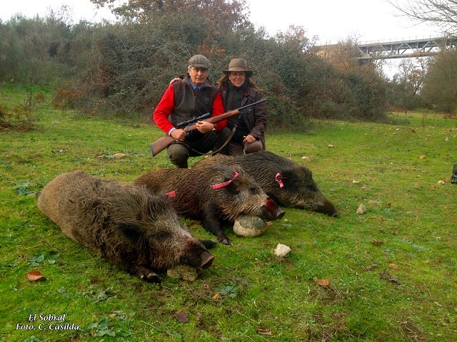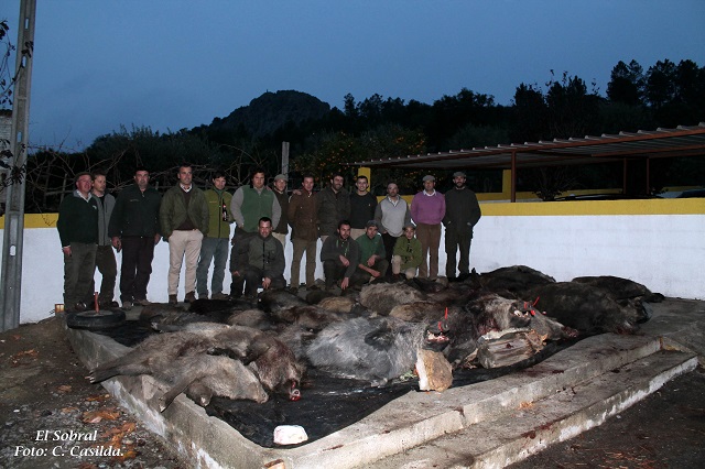 Sobre la una y diez, hora española, los perreros habrían portones y se formó “la de Cristo bendito”: ladras por doquier y carreras en todas direcciones exceptuando hacia la Vía, que por alguna razón, llamémosle aire, los cochinos evitaban sobremanera. Así, de los 13 puestos que ocupaban la línea, tan solo dos de ellos tuvieron oportunidad de jugar lance, siendo esta la armada más desafortunada. En el cierre de la Morra, los primeros disparos los hacía el número 8, seguido de un servidor, que se quedaba con una marrana que había seguido a un cochino como un oso, que debido a andar enfrascado en la limpieza del agua en las gafas me fue imposible tirar, fallándolo estrepitosamente a continuación el ocupante del número tres, indicándome momentos después que le entró de cara y que, viéndole las portentosas defensas, esperó a que le diese el costado para no estropear el trofeo, tapándose y provocando el fallo. Una cochina se cobraba en el 7 y dos en el 6 para completar esta armada, aunque la mejor fue la de la ribera, con diez cochinos abatidos. Sin duda, el puesto de la montería lo tuvieron en esta ocasión D. José Manuel Hernández y Sra., quienes en el número uno de la ribera, conseguían hacerse con seis cochinos, dos de los cuales fueron robados por gente que estaba en la retranca, al igual que otros dos jabalíes de los cierres Alto y Bajo que no fueron hallados después de haberlos marcado. Portugal is different.