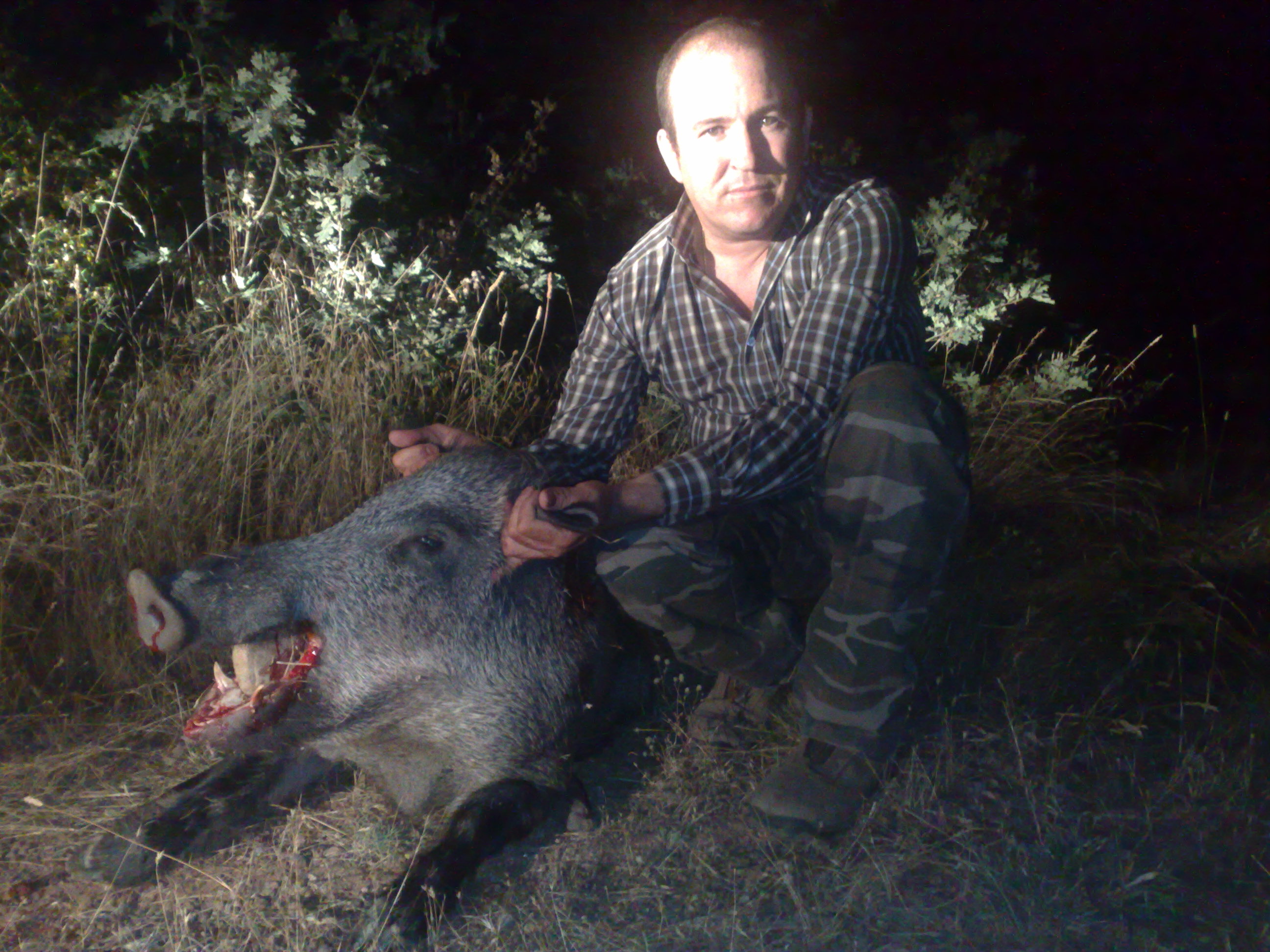 Tan curioso se sentía que arranco a andar entre la cebada, para cuando arranco ya me encontraba yo encarando el rifle y apuntándole siguiendo sus movimientos, no serian mas de las 23 h cuando decido tirar, cometiendo dos errores que serian decisivos para no cobrar el jabalí esa noche, uno de ellos es encender el foco sobre la cebada, ya que con el visor tenía al animal ya centrado en su cuello para disparar, y lo único que conseguí es un reflejo amarillo, sin percibir bien donde disparaba, otro no aprovechar la encina para apoyar el rifle ya que me había quedado el apoyo en el coche, es cochino estaría sobre unos 90 metros ya que su primer intento de salida fue a solo unos 50 metros, el primer día de esperas de este año me jugaría una mala experiencia, cosa que no debía haber ocurrido a un esperista de años, pero las prisas no son buenas consejeras, y después de dar al foco dispare con el consecuente fallo o al menos esos creemos ya que no dimos con sangre aunque ese no es motivo de error ya que he cobrado cochinos sin dar ni una gota de sangre. Respecto al cochino salio despavorido, sin mas miramiento, como un latigazo hacia el monte, seguimos pisteando . Siempre nos queda los pensamientos, y mas de dos días estuve dándole vueltas al lance en donde me había equivocado para no volver a cometer el mismo error, pero si hay algo que aprender de esta lección de humildad al contar mis errores es que ustedes no lo cometan. Después de que te entra un buen cochino, no cabe error ninguno. El cochino en contadas ocasiones dará otra oportunidad como esta. Sobre todo si es en un comedero, son muy reacios a volver a entrar en ellos después de notar algo extraño. Nosotros tuvimos la suerte de dar con el cochino tras 2 hora de pisteo entre jaras, pero los errores se pagan.