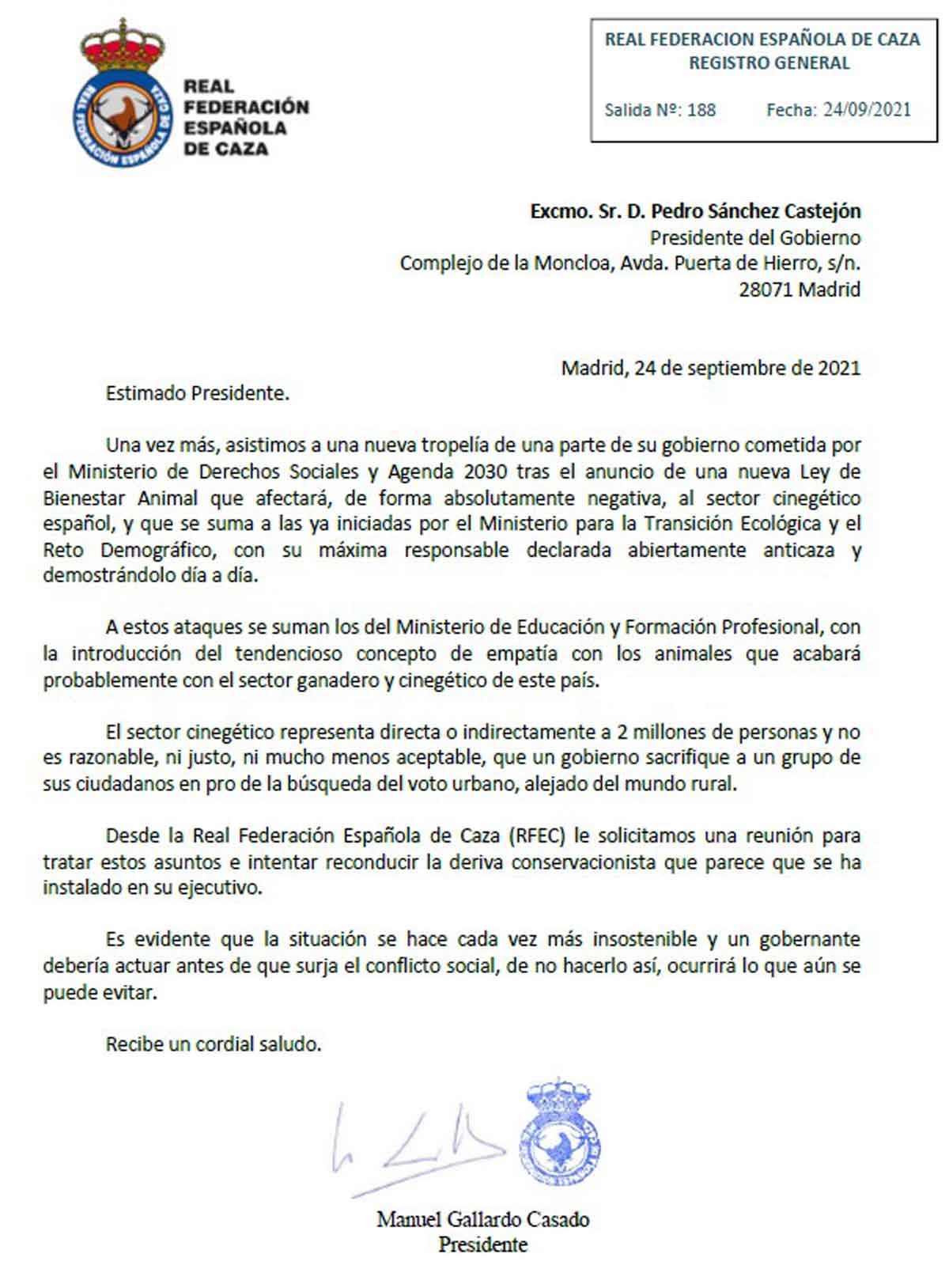 Informa RFEC | El presidente de la Real Federación Española de Caza, Manuel Gallardo, ha enviado una carta al presidente del Gobierno, Pedro Sánchez, advirtiéndole de las graves consecuencias que tendrán las decisiones de sus equipos ministeriales «si se continúa con la deriva anticaza y el estrangulamiento del sector cinegético».