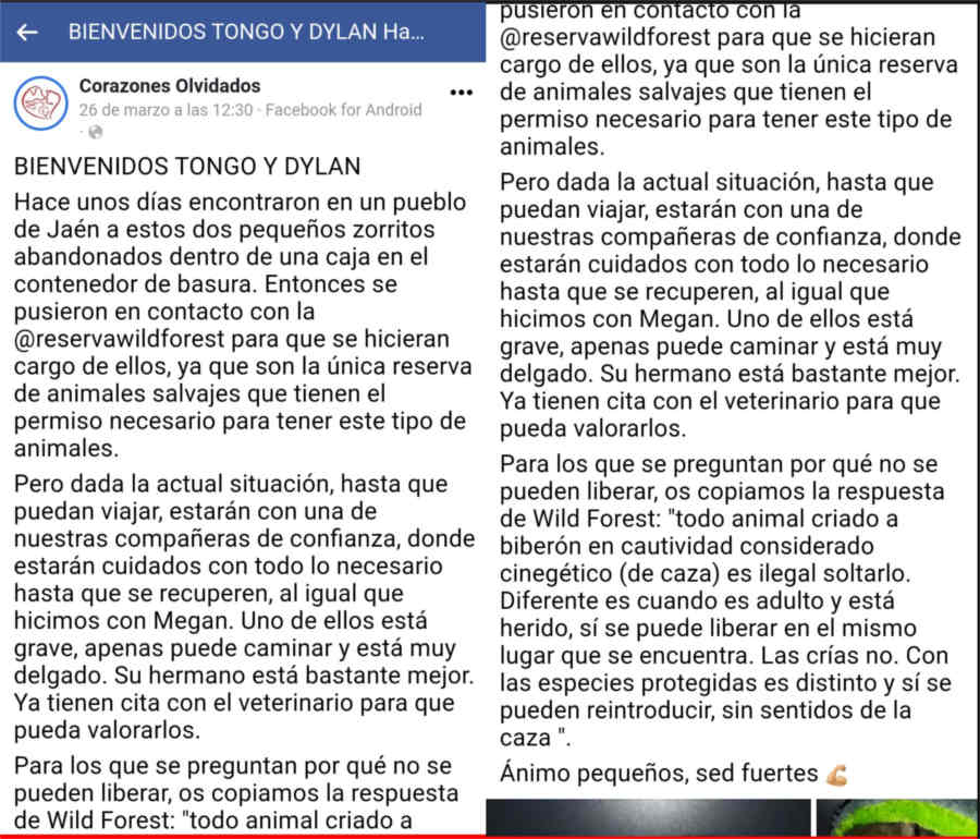 Tras convencer a la mujer y a su hija que cogió los zorros junto a su hija de la necesidad de trasladarlos a su protectora, la animalista contacta con otra protectora de Granada llamada “Corazones Olvidados” para que pueda alojar a las crías hasta su traslado a Cataluña, donde se encuentra la Reserva Wild Forest.